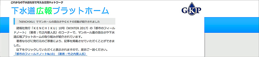 詳細はこちら国土交通省が主体の下水道広報プラットホーム(GKP)に「都市のフィールドノート」の記事が紹介されました。